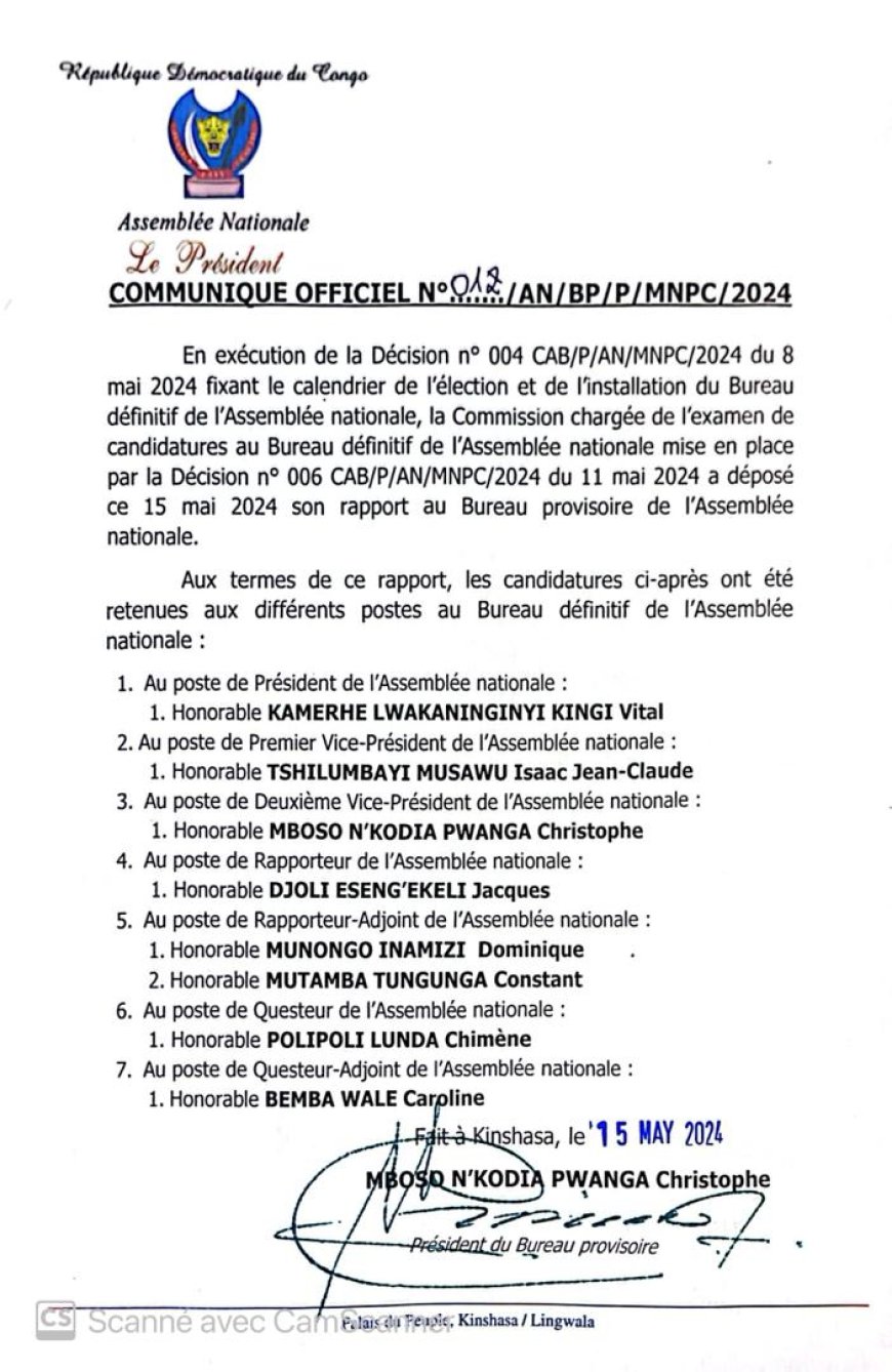 Assemblée nationale : Mboso parmi les candidats retenus pour l’élection du bureau définitif, voici la liste