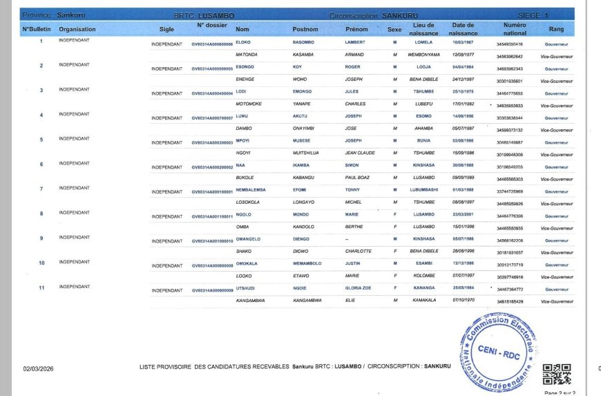 La CENI (Commission électorale nationale indépendante) a rendu publique, ce mercredi 4 mars 2026, la liste provisoire des candidats à l’élection du gouverneur et du vice-gouverneur de la province du Sankuru.